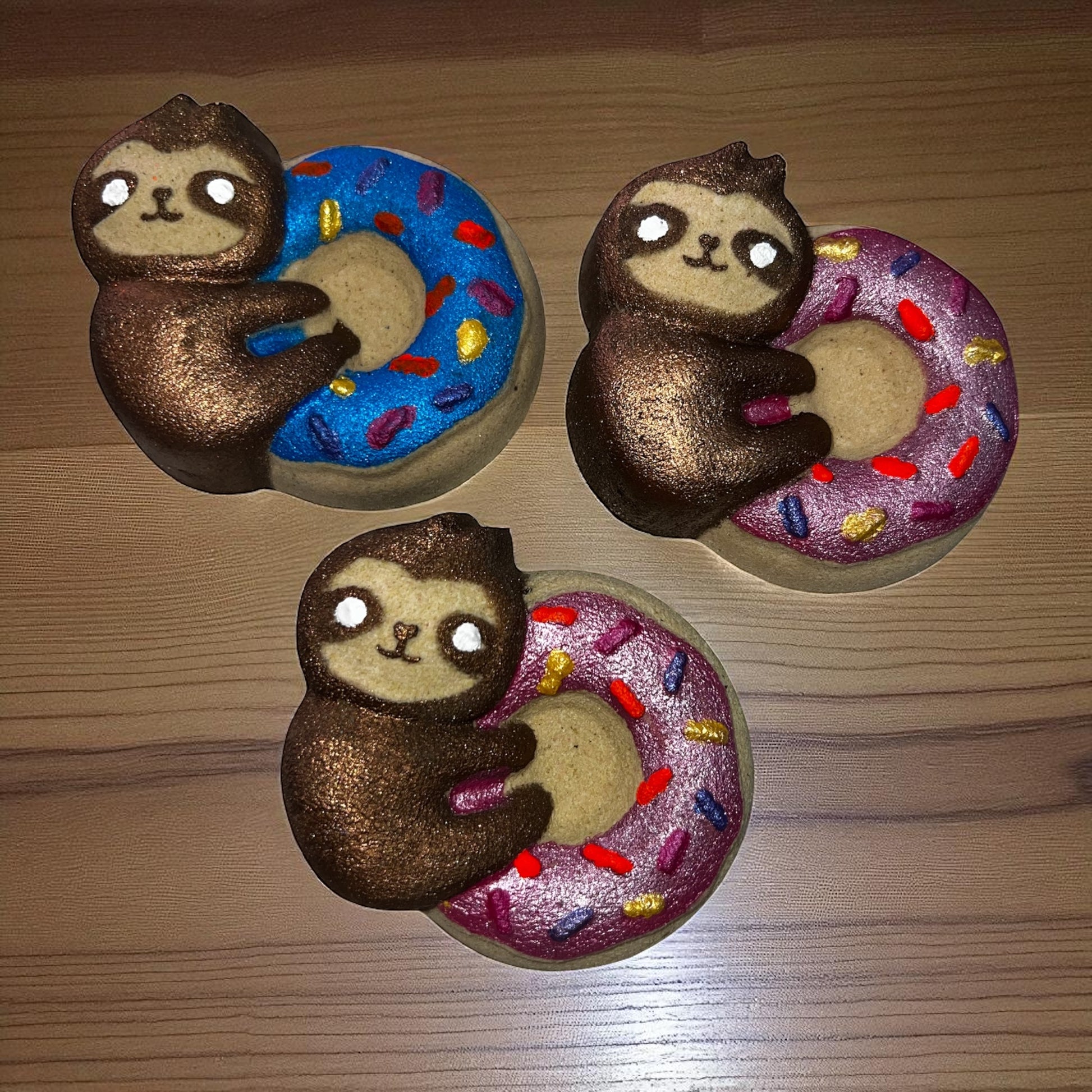 Indulge your inner child with Fruity Loops bath bombs! These fruit loops inspired bombs feature adorable sloth designs and decadent frosting-covered donuts with sprinkles. Perfect for a fun and playful bath time experience. (Sloth and sweet tooth approved!)